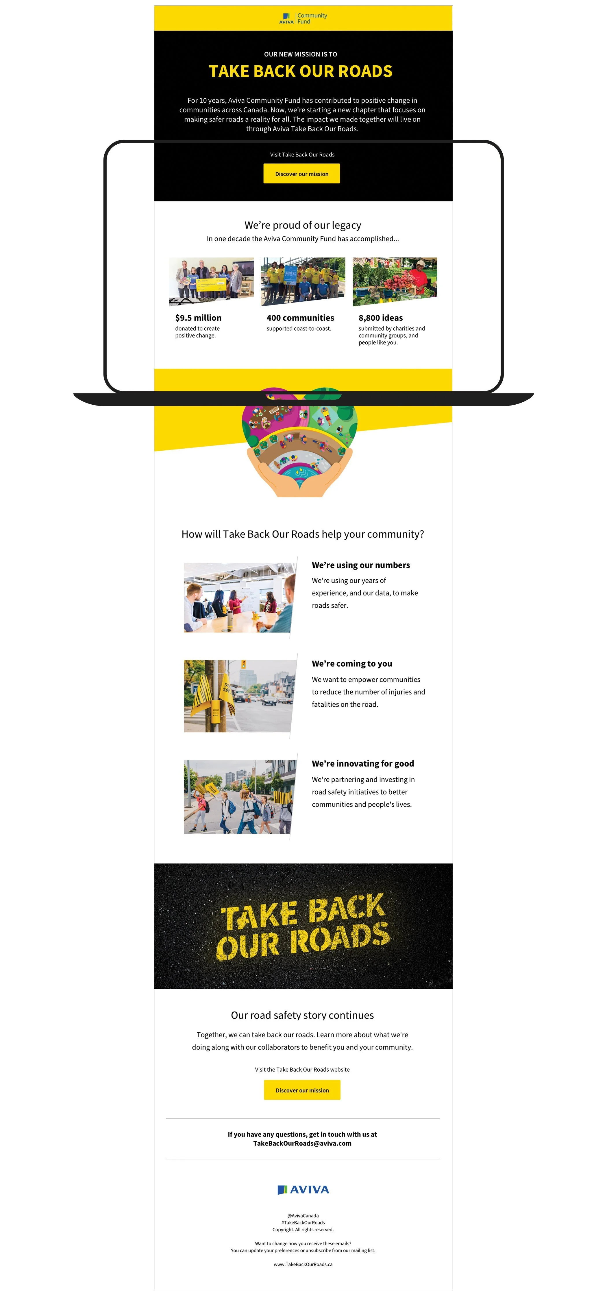 Take Back Our Roads is Aviva’s newest CSR program that replaces the Aviva Community Fund which has been in place for ten years. This program tackles dangerous roads and school zones across Canada to reduce serious injuries and fatalities. We were tasked with not only crafting a new brand for the program but also ensuring a smooth transition between the programs for existing supporters of the Aviva CSR program.